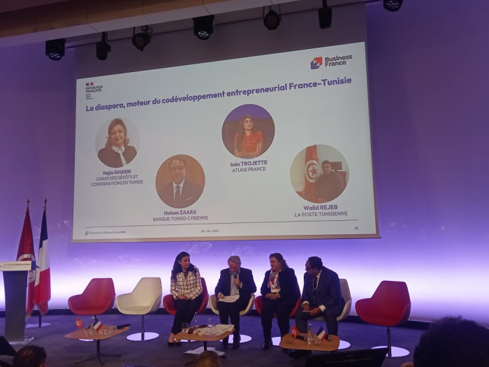 Lors du panel intitulé « La diaspora, moteur du co-développement entrepreneurial France–Tunisie », la Directrice Générale de la Caisse des Dépôts et Consignations, Mme Nejia Gharbi, est intervenue pour présenter le projet DIASDEV, une initiative innovante dédiée aux Tunisiens résidant à l’étranger (TRE), ainsi que par la participation de la Poste Tunisienne, représentée à distance par M. Walid Rejeb, à travers une présentation mettant en avant ses initiatives en matière de services financiers et de transfert de fonds destinés à la diaspora.